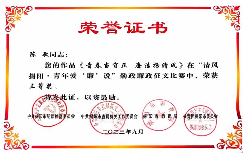 清風潤初心,青年說清廉。為深入學習貫徹黨的二十大精神,強化廣大青年的廉潔自律意識,增強青年黨員干部廉潔從政、廉潔用權(quán)、廉潔修身、廉潔齊家的思想自覺,切實做好青年廉潔文化建設(shè)工作,市紀委、市直工委、市教育局、團市委聯(lián)合舉辦“清風揭陽·青年愛‘廉’說”勤政廉政征文比賽。揭陽市投資控股集團有限公司陳敏參加征文活動,并榮獲三等獎。