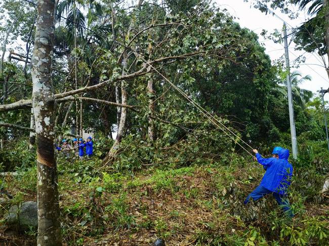 到達(dá)海南后,揭陽明利綜合能源發(fā)展有限公司支援海南抗災(zāi)搶險(xiǎn)隊(duì)在澄邁縣緊鑼密鼓開展搶修復(fù)電工作。澄邁地貌相對(duì)平整,但林區(qū)覆蓋率較高,橡膠林香蕉園廣泛分布,臺(tái)風(fēng)摩羯過境后,林區(qū)樹木倒塌壓垮電線,線路損壞嚴(yán)重。為打通線路搶修通道,加快復(fù)電進(jìn)度,公司搶險(xiǎn)隊(duì)伍一邊組織大型施工機(jī)械快速重新組立電桿,一邊組織人員及時(shí)消缺搶修,力爭(zhēng)以最快速度恢復(fù)線路正常供電。